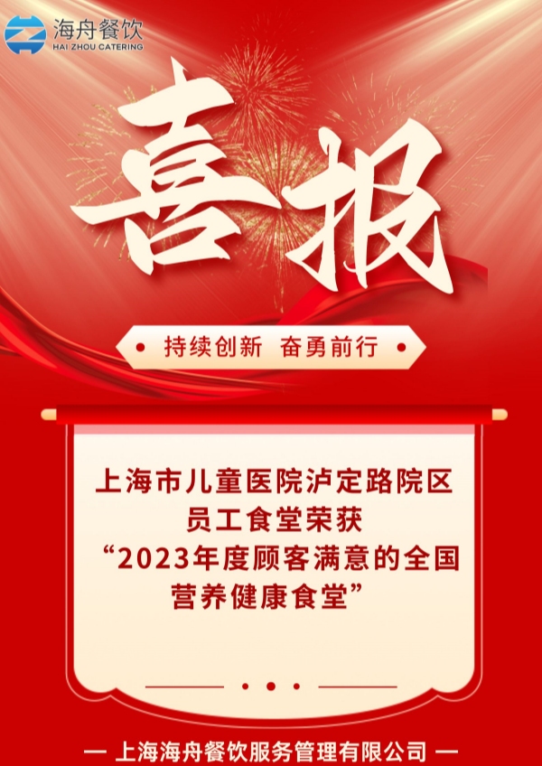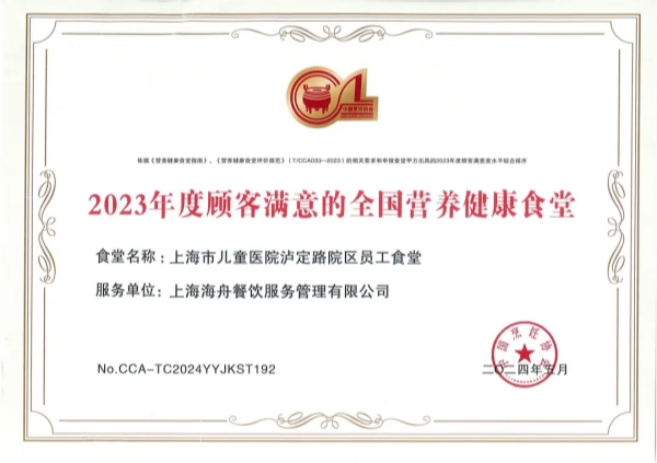五月,上海海舟餐飲服務(wù)管理有限公司旗下兒童醫(yī)院瀘定路院區(qū)員工食堂榮獲“2023年度顧客滿意的全國(guó)營(yíng)養(yǎng)健康食堂”。
